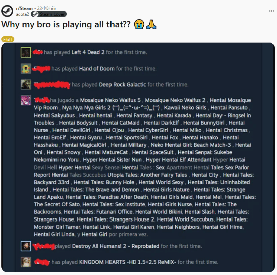 近日在外網論壇reddit上面有一外國網友在steam板塊發了發自己的牢騷:“為什么我的哥哥總是在玩這些NSFW游戲!”搭配上該網友使用的emoji表情可以看出他確實十分絕望了。