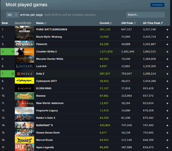 《戰(zhàn)地6》發(fā)售僅一天,就迅速?zèng)_上Steam史上最熱門游戲榜,成為Steam平臺(tái)史上第14大最受歡迎游戲(按同時(shí)在線玩家數(shù)計(jì)算)。在發(fā)售24小時(shí)內(nèi),其Steam同時(shí)在線人數(shù)達(dá)到747,440人,