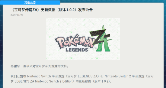 11月6日,《寶可夢傳說:Z-A》日文網站顯示,Game Freak現已推出游戲的1.0.2 版本。版本更新內容如下:1.如果你在第一次超級進化對戰之前,寶可夢盒子已經滿了,但你卻一直沒有打