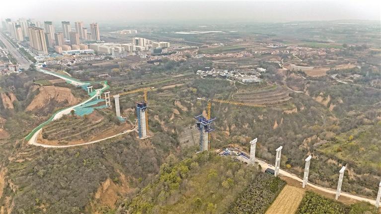 長武縣彭長公路鴉兒溝大橋項目建設現場(11月5日攝)。  本報記者 琚鵬飛文/圖  在長武縣,一條條農村公路像絲帶般,串起一個個村莊、一片片果園、一處處景點。  11月5日,在長武縣彭長公路鴉兒溝大橋項目建設現
