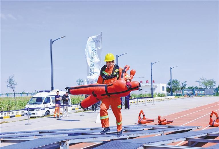9月10日,在第25屆全國煤炭行業職工職業技能示范賽上,張義在參加坡道運送傷員競賽(資料照片)。 受訪單位供圖 本報通訊員 馬帝華 9月11日,第25屆全國煤炭行業職工職業技能示范賽(礦山救護工)賽場傳來捷報:陜煤