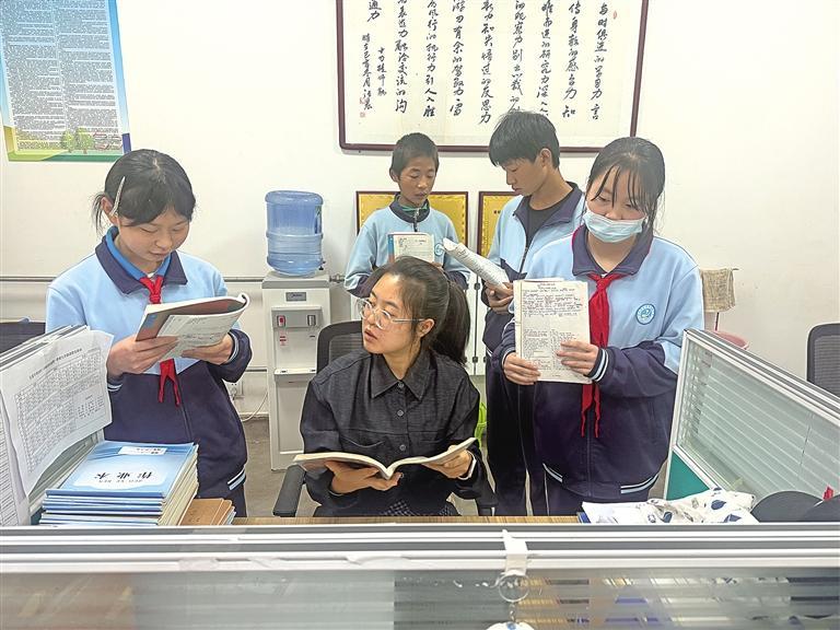 9月30日,尚敏在辦公室為學生答疑解惑?! ”緢笥浾?郭妍文/圖 “今天在數學課上,你們班的學生聽講很專注”“昨天的英語作業完成得很不錯,我在課上表揚他們了”……如今,代課老師幾乎每天都會告訴咸陽市長武縣巨