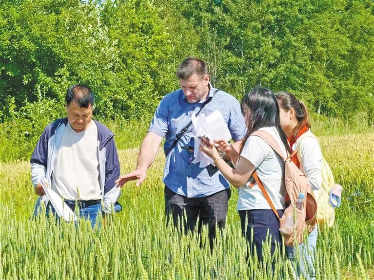 中白海外農業科技示范園里,中白師生在查看小麥生長狀況(資料照片)。 受訪單位供圖 本報記者 付玉瑋 通訊員 周天弘 張晴 秋日的白俄羅斯,天氣涼爽宜人?! ?0月9日清晨,在白俄羅斯東部的西北農林科技大學中