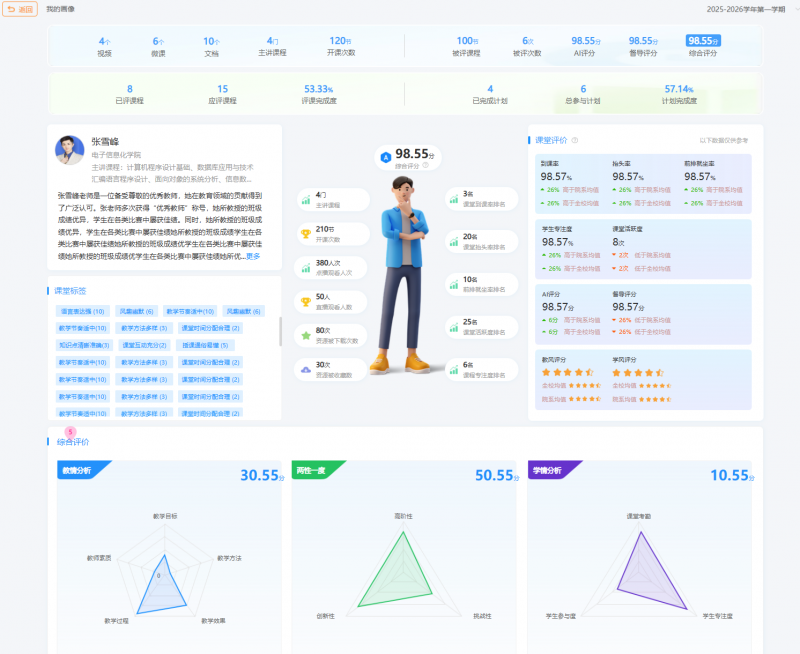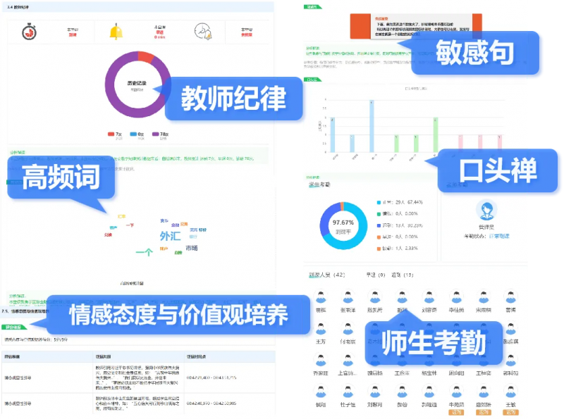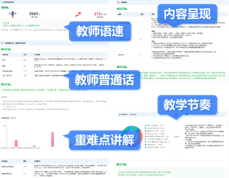 基于長時(shí)間跟蹤老師課堂情況,持續(xù)匯聚與分析的多維度課堂數(shù)據(jù)要素,生成高精準(zhǔn)的教師畫像。畫像涵蓋了括AI評分、督導(dǎo)評分、教情評分、學(xué)情評分、教風(fēng)評分、學(xué)風(fēng)評分,展示教師的課堂工作量、課堂投入情況、課堂效果、授課特征、教學(xué)風(fēng)格,為教師自我改進(jìn)和專業(yè)發(fā)展提供依據(jù)。