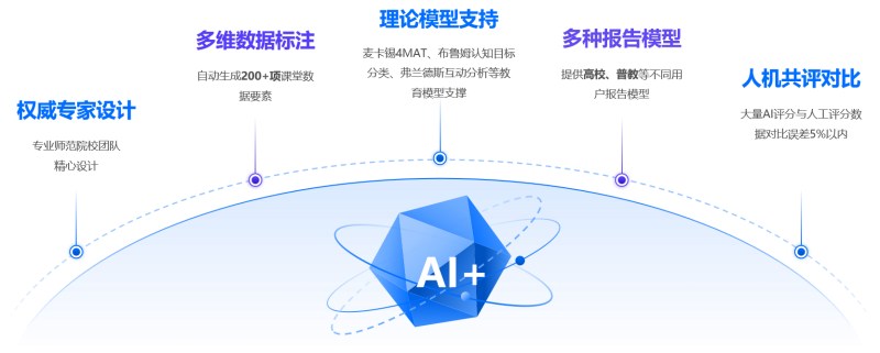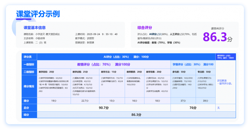課堂數(shù)據(jù)采集完成后,系統(tǒng)自動(dòng)調(diào)用DeepSeek大模型對200+項(xiàng)課堂數(shù)據(jù)分析,根據(jù)評價(jià)模板生成智能、全面、專業(yè)的課堂AI評價(jià)報(bào)告。評價(jià)模板可為學(xué)校量身定制。銳取課堂AI評價(jià)報(bào)告基于課堂數(shù)據(jù)要素報(bào)告,為學(xué)情、教情、課堂情況提供精準(zhǔn)量化的綜合評分,為教育生態(tài)帶來理性洞察,讓課堂評價(jià)有據(jù)可依,讓專業(yè)成長有跡可循。