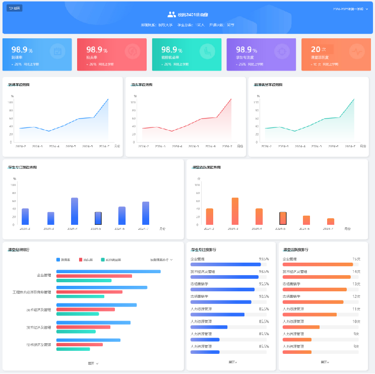 班級畫像模塊可查看班級基本信息,包括到課率、抬頭率、前排就坐率、學(xué)生專注度、課堂活躍度等關(guān)鍵數(shù)據(jù)。縱向以時(shí)間跨度對比,生成數(shù)據(jù)趨勢圖,追蹤班級變化;橫向以不同課堂數(shù)據(jù)對比,生成數(shù)據(jù)排行榜單,為班級管理優(yōu)化提供清晰依據(jù)。