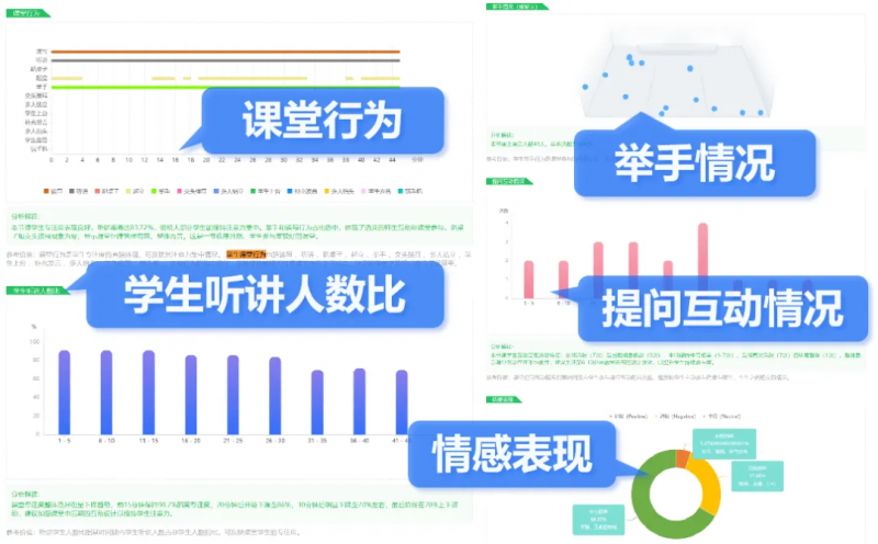 課堂數(shù)據(jù):AI精準(zhǔn)識別老師巡視、板書、講授、提問、演示、紀(jì)律管理、課堂情緒及學(xué)生讀寫、聽講、趴桌子、起立、舉手、交頭接耳、玩手機(jī)等行為,完整記錄課堂過程