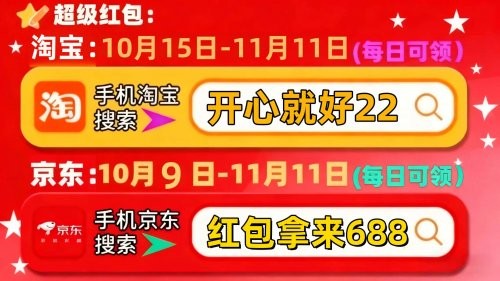 京東領取時間:10月9日-11月11日,淘寶領取時間:10月15日-11月11日。