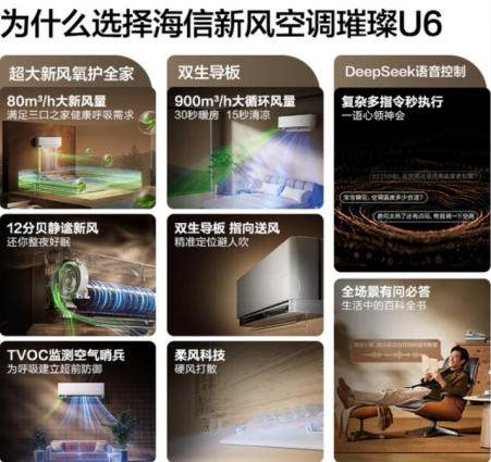操作技術(shù)上,海信新風(fēng)空調(diào)璀璨U6掛機(jī)支持“一句話多指令”的Deepseek語音系統(tǒng),躺著說一句“開空調(diào)、開新風(fēng)、不要直吹”,就能同步響應(yīng),格外省心。