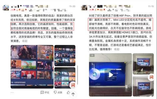 自上市以來,創(chuàng)維6系產(chǎn)品在全渠道表現(xiàn)亮眼:京東與天貓等電商平臺(tái)累計(jì)用戶評(píng)價(jià)已突破一萬(wàn)條,其中京東平臺(tái)好評(píng)率持續(xù)保持在100%的高位。從這些真實(shí)反饋中可清晰看到,“畫質(zhì)清晰”“色彩飽滿細(xì)膩”“畫質(zhì)銳利”“不反光”“音效特別震撼”“聲場(chǎng)立體又飽滿,看大片像在電影院一樣”“界面很人性化”“語(yǔ)音控制超方便”等關(guān)鍵詞,成為用戶集中認(rèn)可的亮點(diǎn)。同時(shí),在電商平臺(tái)上,用戶真實(shí)評(píng)價(jià),直接回應(yīng)著“創(chuàng)維電視怎么樣“、“創(chuàng)維電視好不好”等疑問,為潛在用戶提供最直觀的參考依據(jù)。